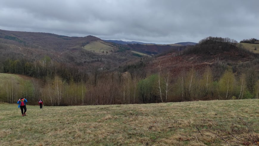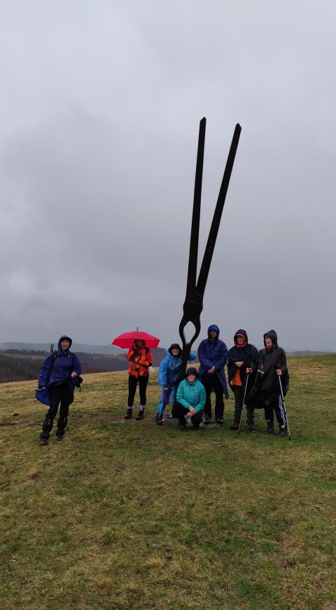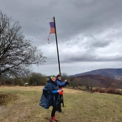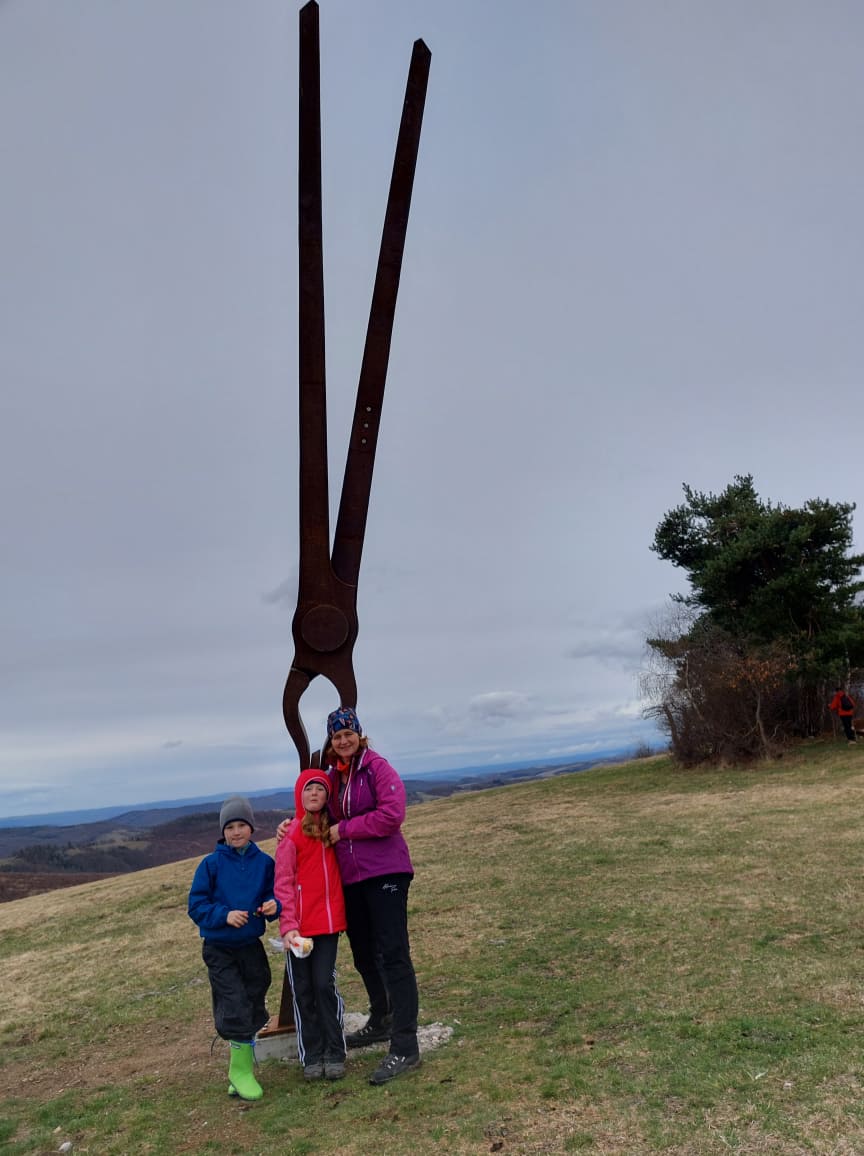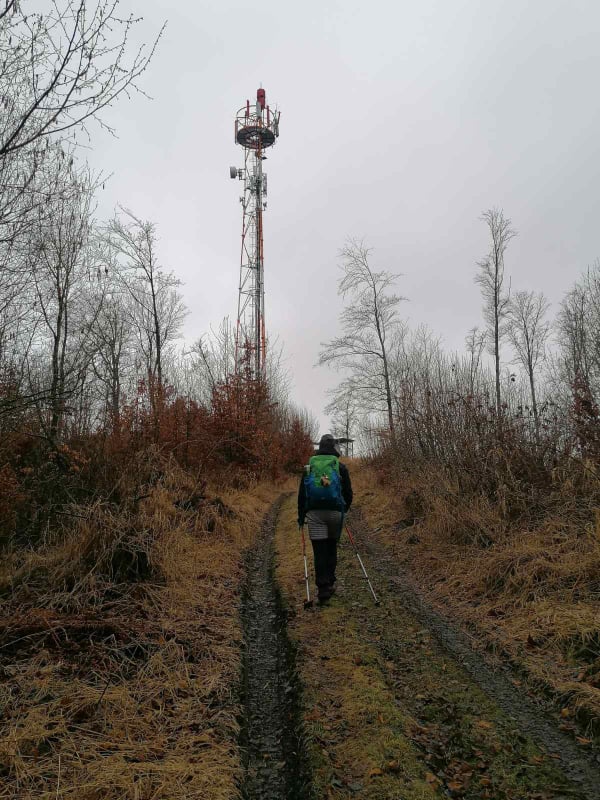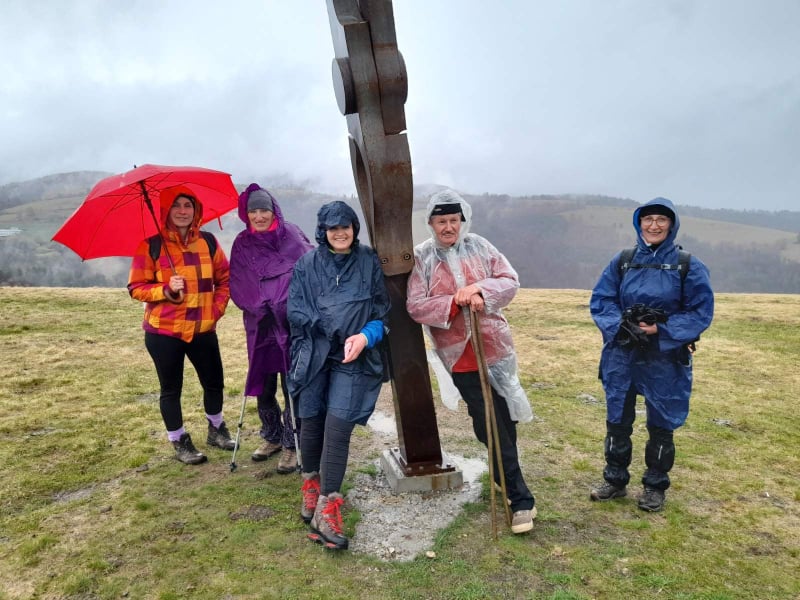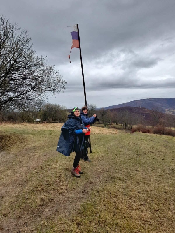 čo ma veľmi potešilo a príjemne prekvapilo. Popod Štepov vrch stúpame po zelenej na Laz, kde sa zelená križuje s červenou (Cestou Márie Széchy). Ale čo sme nechceli, už je to tu! Mraky, začínajúci dážď. Nútení sme z batohov povyberať pršiplášte (ale my sme pripravení aj na tento variant). Dážď nezabráni tomu, aby sme zapózovali pri kliešťoch a pokračujeme smerom na Polom. Dážď a vietor sa stupňuje, ale my sme už relatívne v bezpečí.