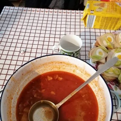 členky Kamilky je druhý turistický tím, ktorý sa postaral o „popročské mňamky, mňamky z kotlíka“. Na biku dorazil turista, Peťo, ktorý hádam jediný v tento deň zmokol. V poobedňajších hodinách na prekvapenie dorazil do cieľa aj tím našich najmladších turistov. A ako sa povie, „dobrých ľudí sa veľa zmestí“, nás sa do jednej kuchyne a izby napratalo nakoniec 28 turistov (ak som dobre spočítala).