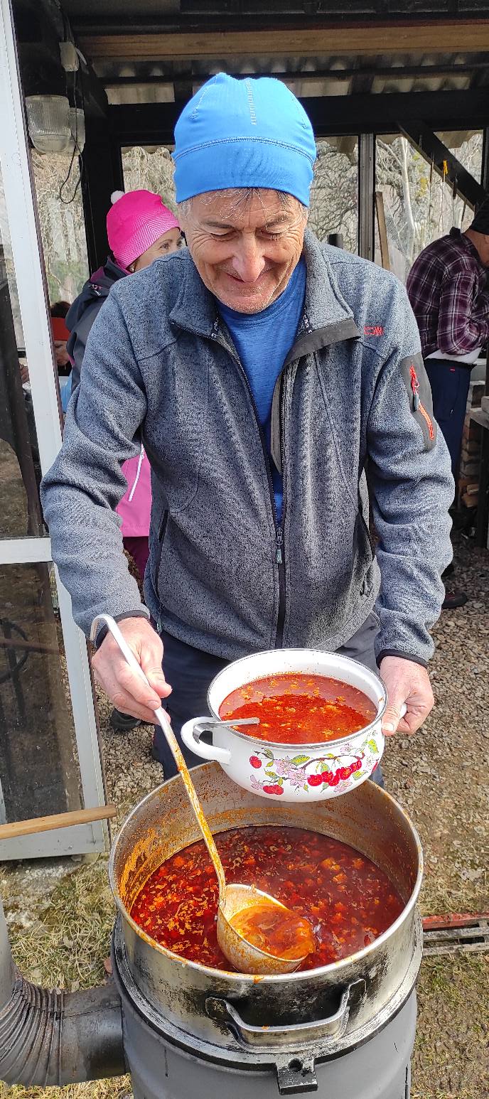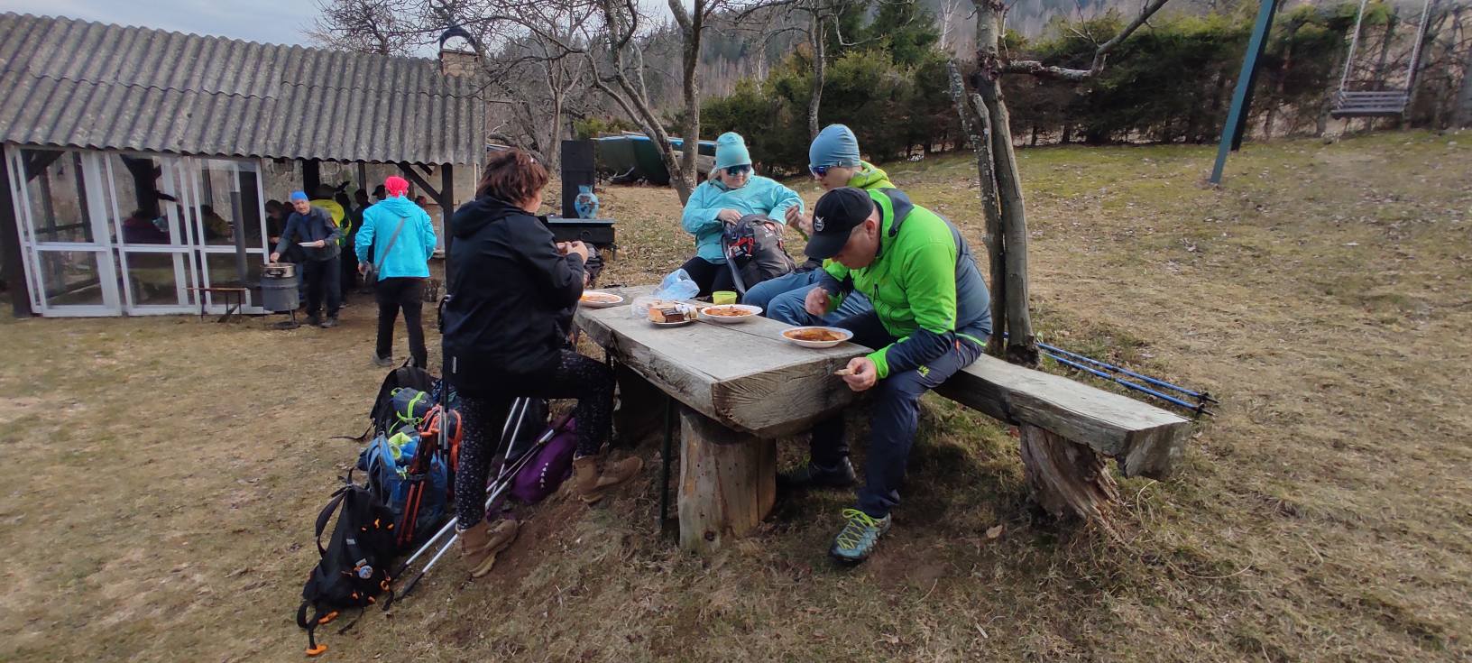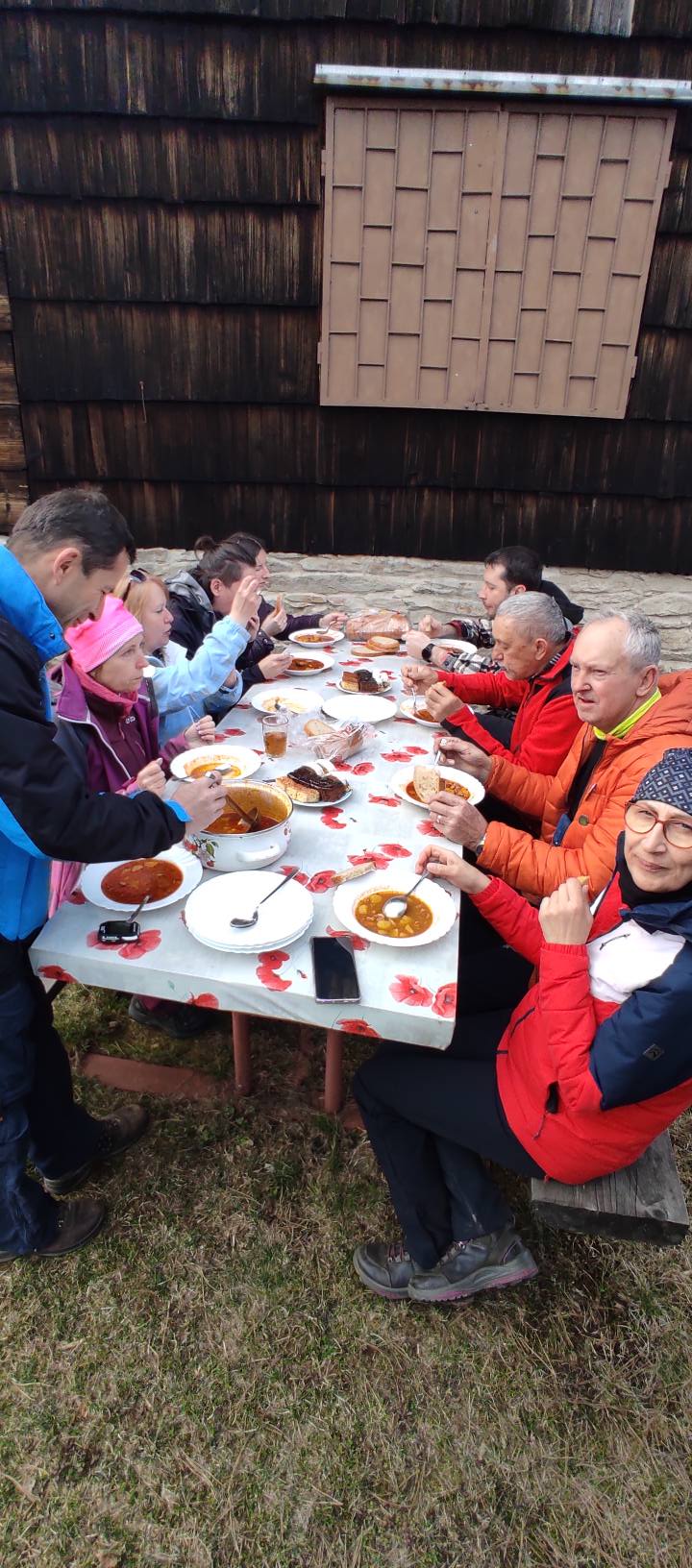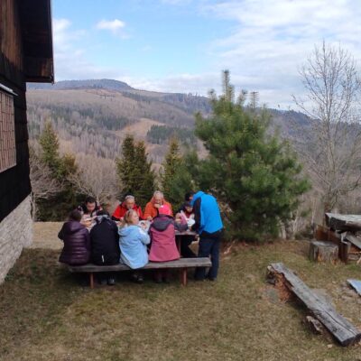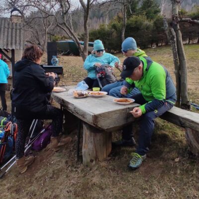Klesáme lesnou cestičkou a pomaly prichádzame ku chate, kde nás čaká občerstvenie od „chatára spod Železnej brány“. Výborný guľášik, koláčiky, kávička, no čo viac by si mohli turisti priať po celom dni chodenia po Veporských vrchoch. A tak sme tento krásny deň zakončili opäť všetci pokope v spoločnosti dobrého jedla, smiechu a vravy.