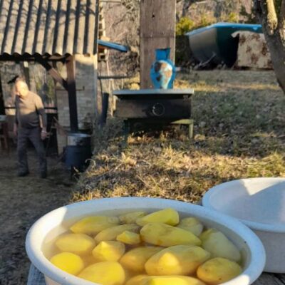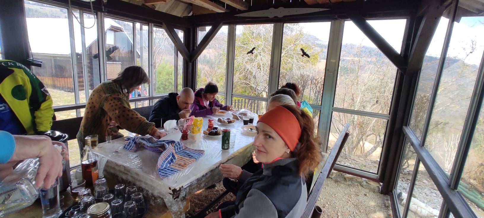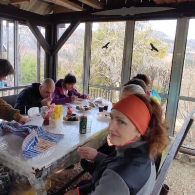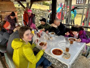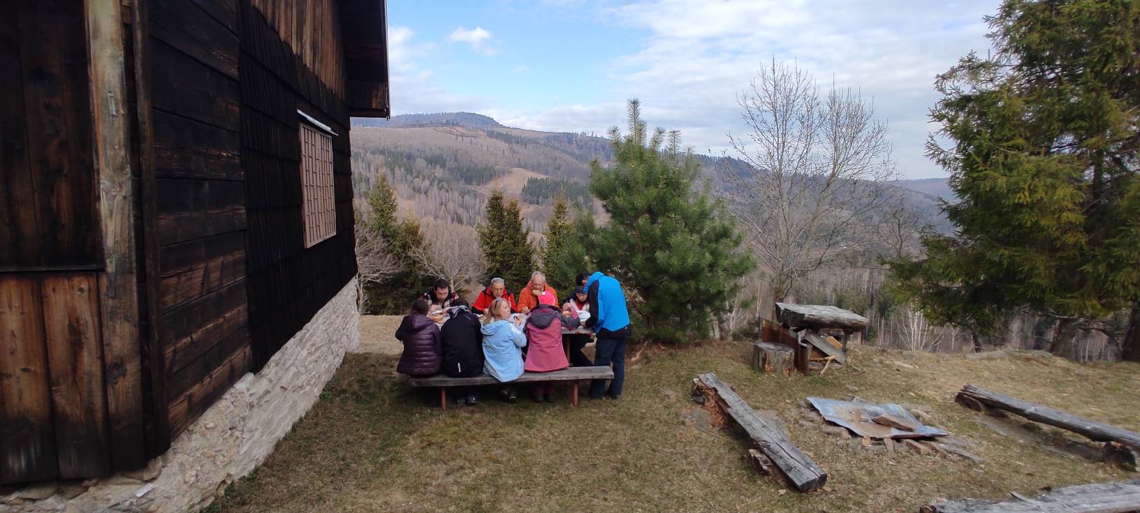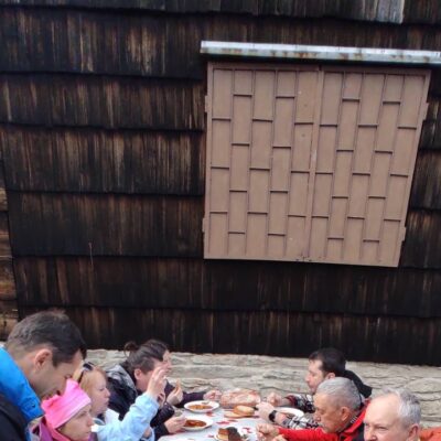Klesáme lesnou cestičkou a pomaly prichádzame ku chate, kde nás čaká občerstvenie od „chatára spod Železnej brány“. Výborný guľášik, koláčiky, kávička, no čo viac by si mohli turisti priať po celom dni chodenia po Veporských vrchoch. A tak sme tento krásny deň zakončili opäť všetci pokope v spoločnosti dobrého jedla, smiechu a vravy.