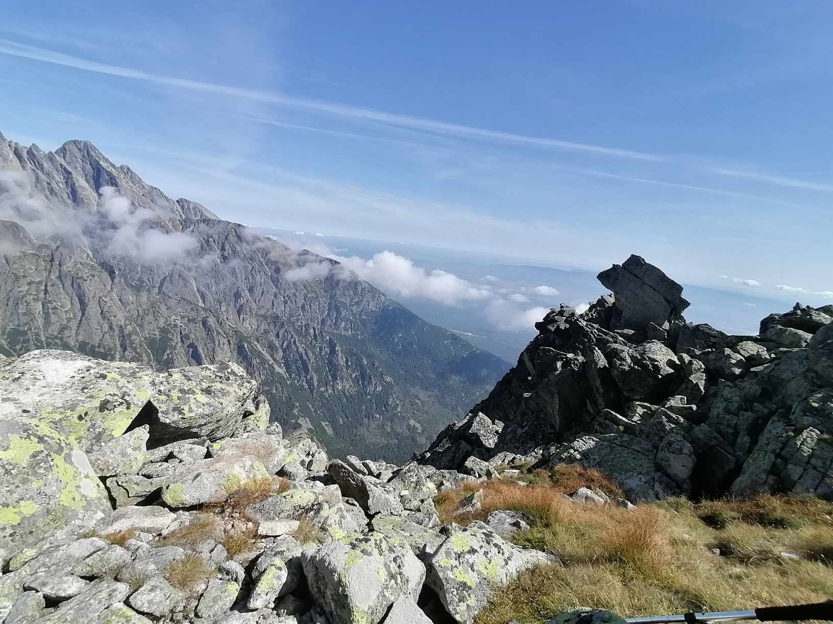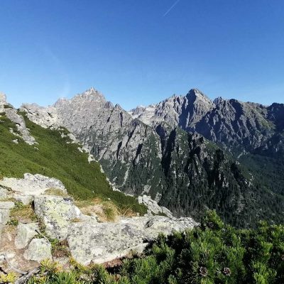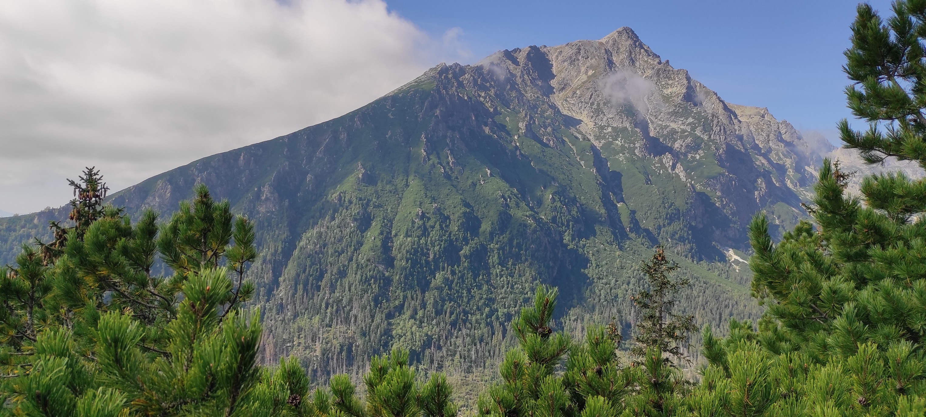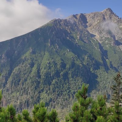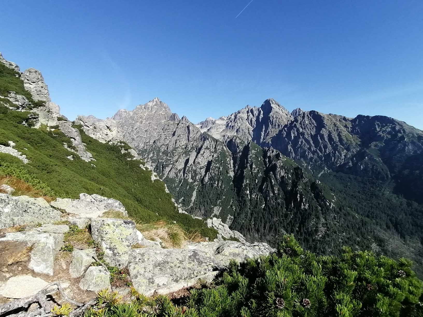 Slniečko tak ako my pomaly stúpa vyššie a vyššie a pri rázcestí pod Slavkovským štítom dávame dole vrchné vrstvy oblečenia. Ako sa mení les v kosodrevinu, nám sa začínajú odkrývať prvé výhľady, aj keď zatiaľ len do dolín.
