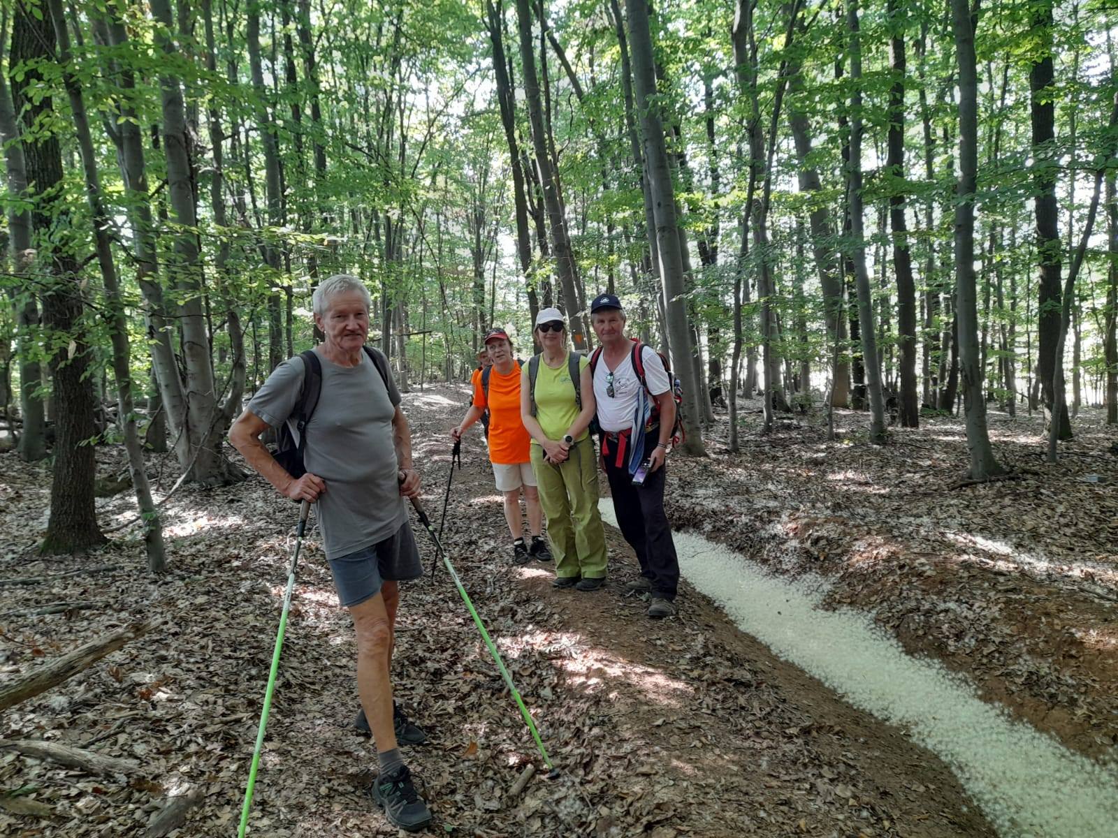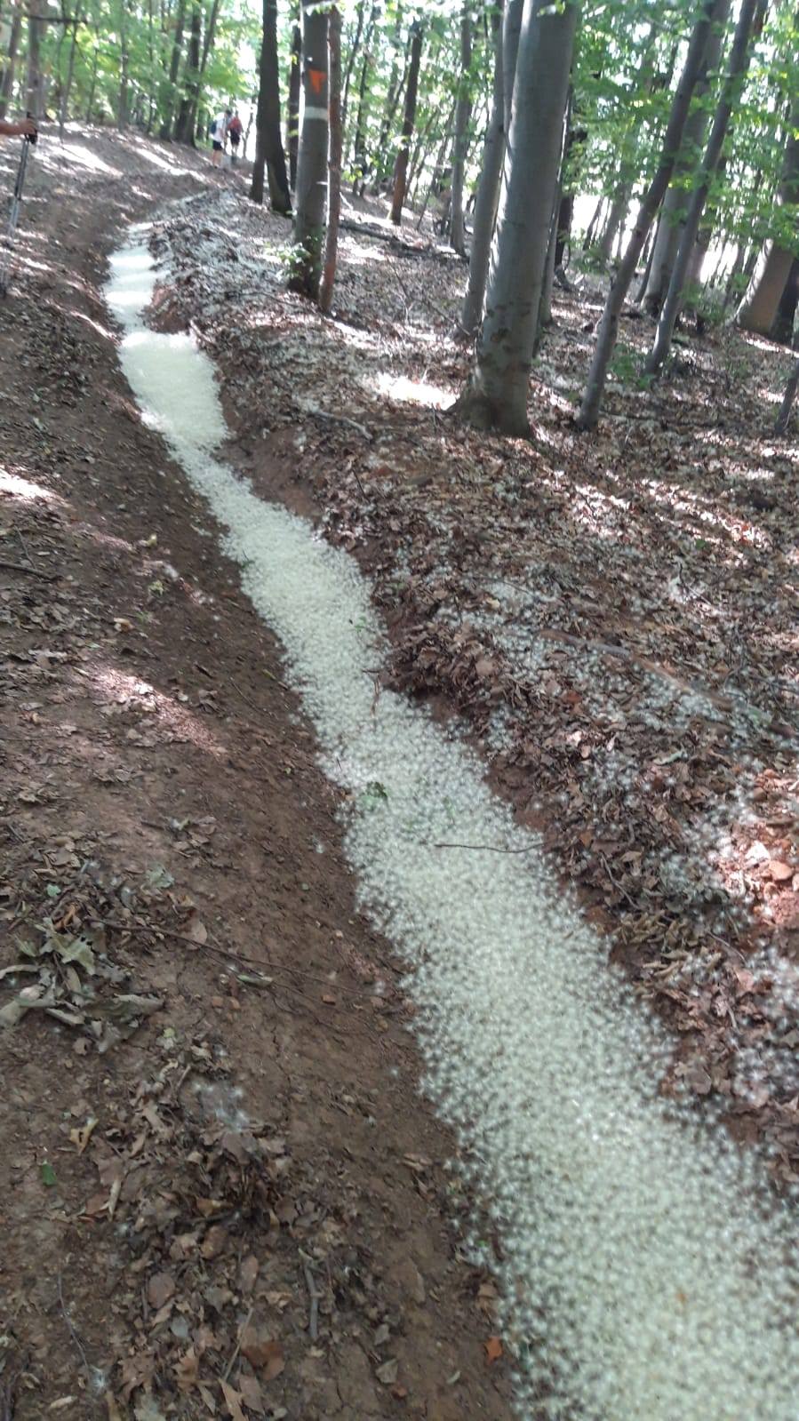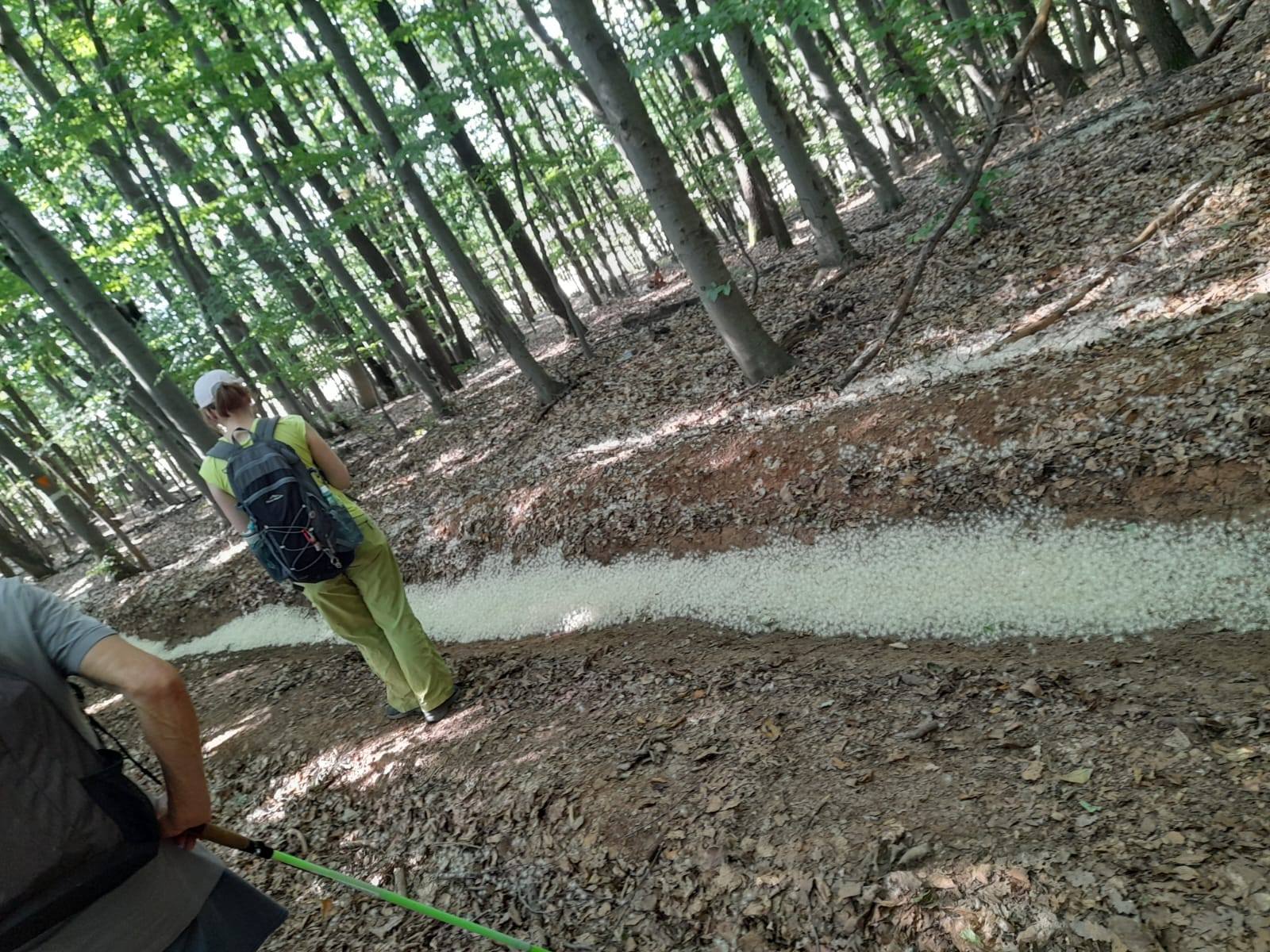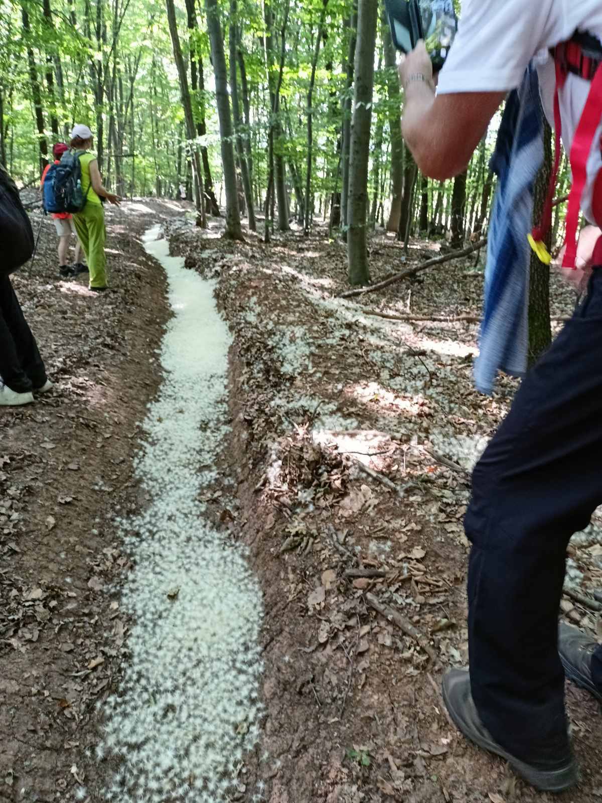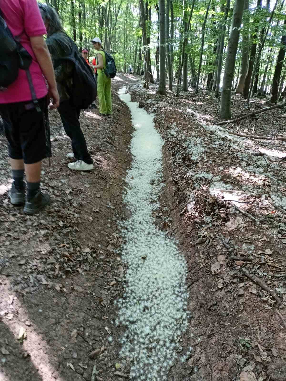 Vyrazili sme popri trati po žltej do mierneho kopca a o chvíľu sme už kráčali horou smerom k brezovskej šťavici. Míňali sme potok Žernovec stekajúci okolo šťavice z vrchov. V tomto suchom počasí bol napodiv dobre zásobený vodou. Pri šťavici sa k nám pridal pätnásty turista, ktorý sa tam zrazu objavil, ale na jeho nečakané príchody a odchody sme si už zvykli. Stúpali sme v príjemnom chládku stromov až na lúku na Zahradách, odtiaľ striedavo horou a lúkami až na Klinové. Cestou z Klinového na Boľfovo nás prekvapil zaujímavý prírodný úkaz – biele semená facélie vratičolistej pripomínajúce veľké snehové vločky, ktoré zrejme vietor navial do koľají na ceste a ktoré vytvárali dojem snehových závejov.