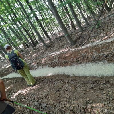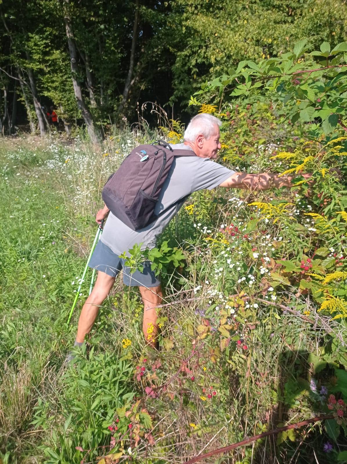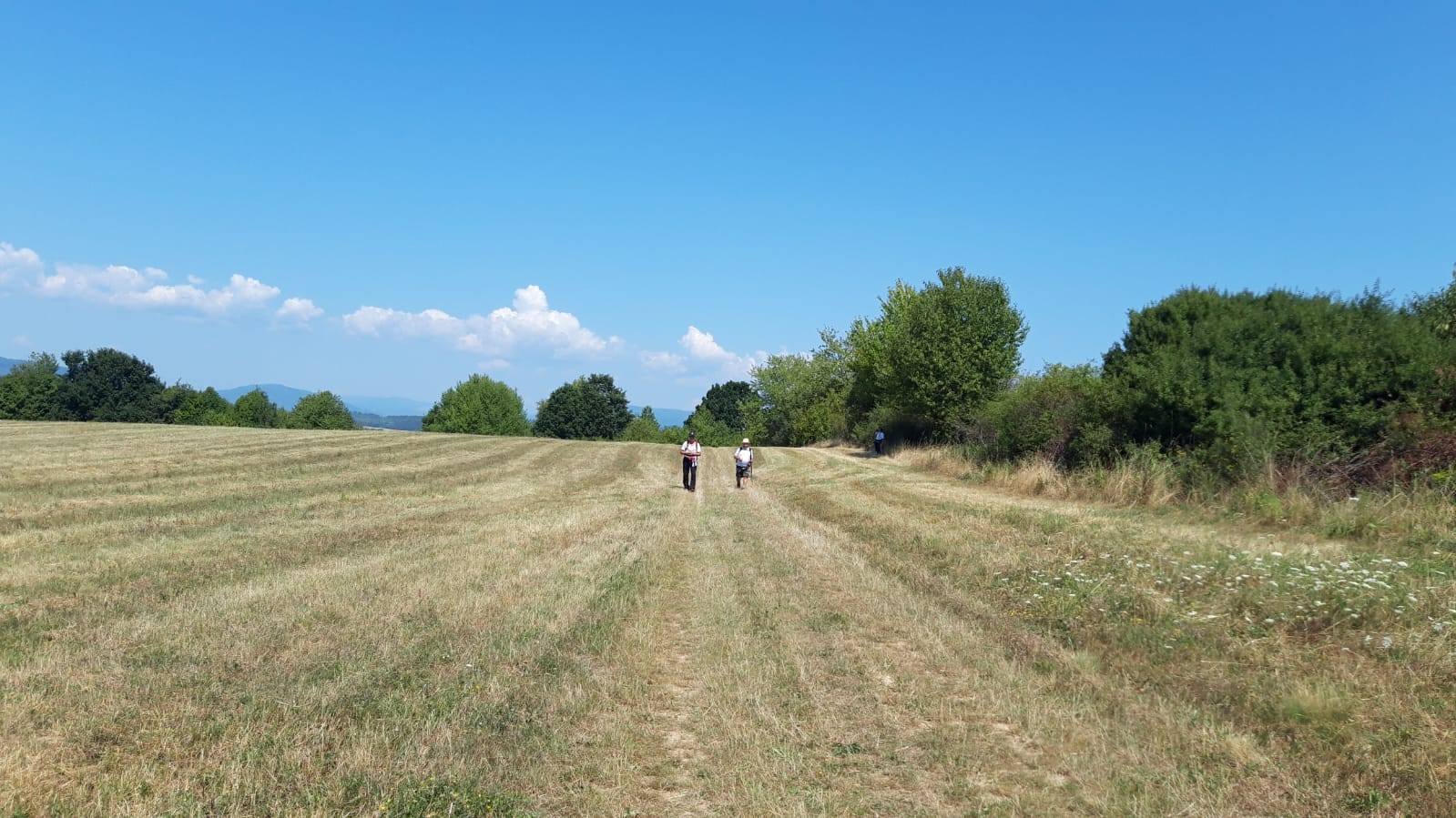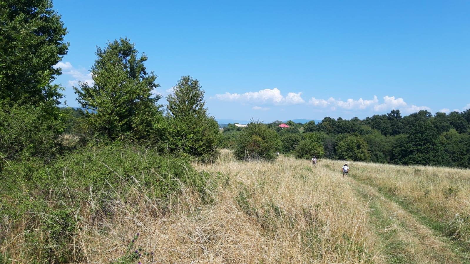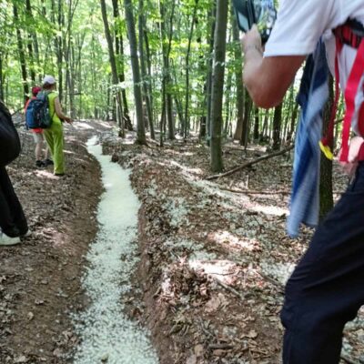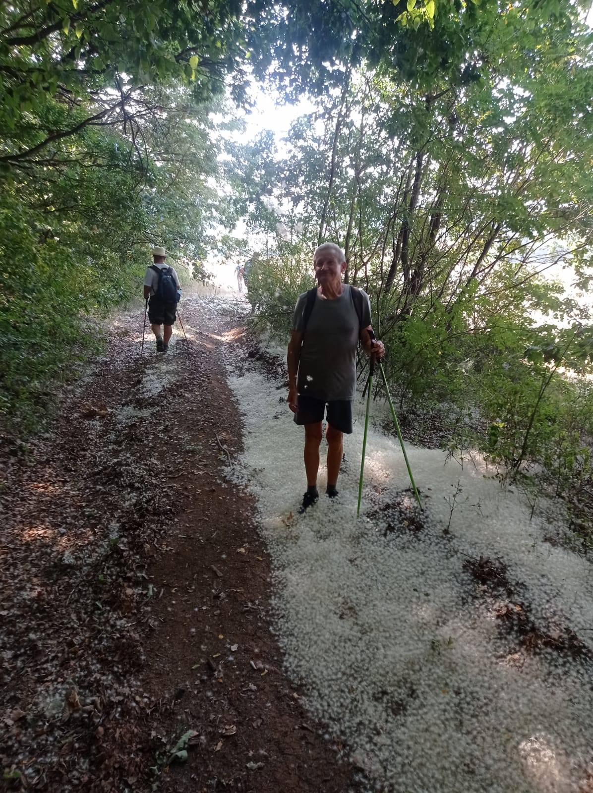 Vyrazili sme popri trati po žltej do mierneho kopca a o chvíľu sme už kráčali horou smerom k brezovskej šťavici. Míňali sme potok Žernovec stekajúci okolo šťavice z vrchov. V tomto suchom počasí bol napodiv dobre zásobený vodou. Pri šťavici sa k nám pridal pätnásty turista, ktorý sa tam zrazu objavil, ale na jeho nečakané príchody a odchody sme si už zvykli. Stúpali sme v príjemnom chládku stromov až na lúku na Zahradách, odtiaľ striedavo horou a lúkami až na Klinové. Cestou z Klinového na Boľfovo nás prekvapil zaujímavý prírodný úkaz – biele semená facélie vratičolistej pripomínajúce veľké snehové vločky, ktoré zrejme vietor navial do koľají na ceste a ktoré vytvárali dojem snehových závejov.