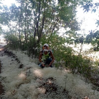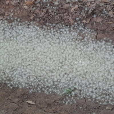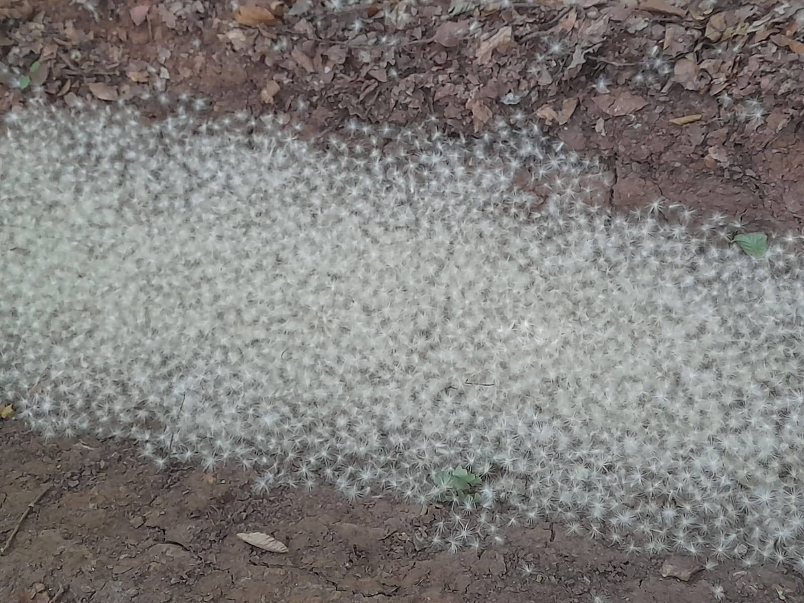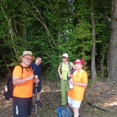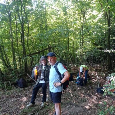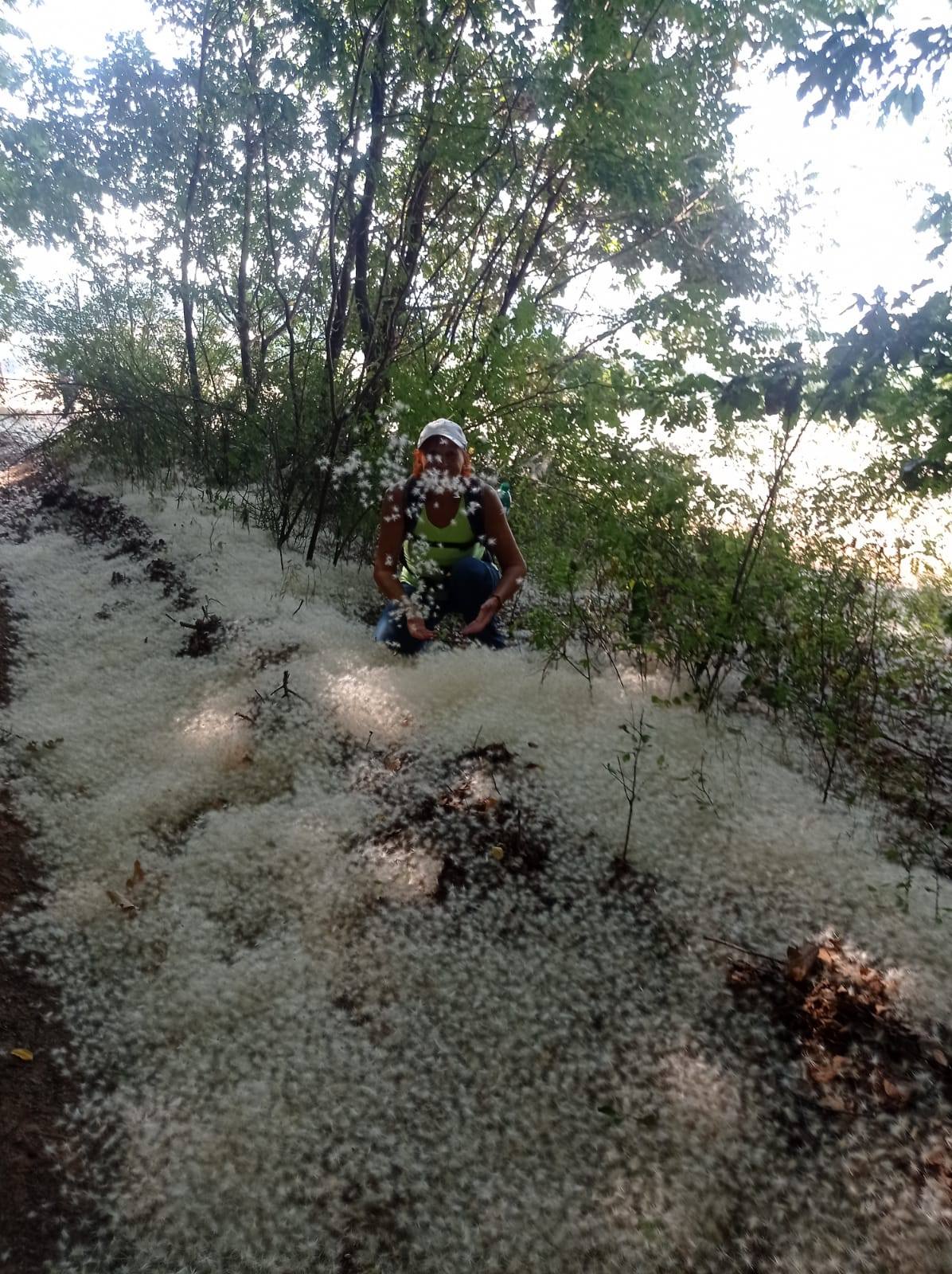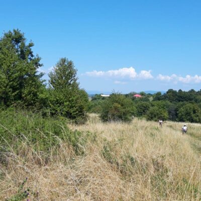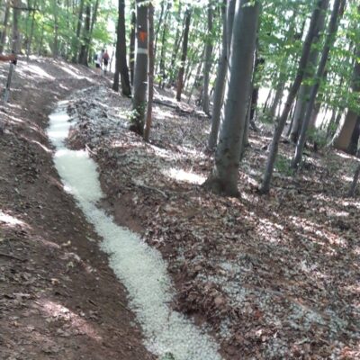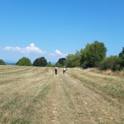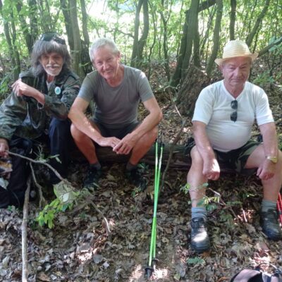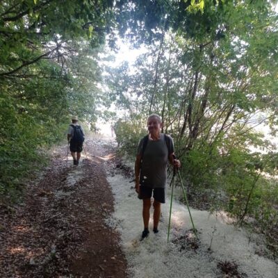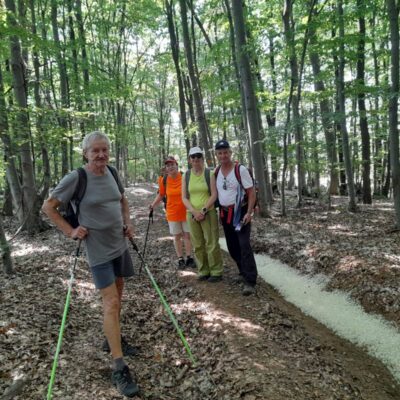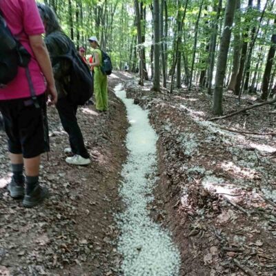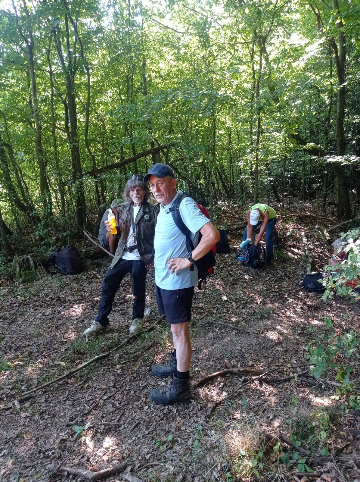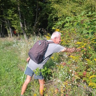 Vyrazili sme popri trati po žltej do mierneho kopca a o chvíľu sme už kráčali horou smerom k brezovskej šťavici. Míňali sme potok Žernovec stekajúci okolo šťavice z vrchov. V tomto suchom počasí bol napodiv dobre zásobený vodou. Pri šťavici sa k nám pridal pätnásty turista, ktorý sa tam zrazu objavil, ale na jeho nečakané príchody a odchody sme si už zvykli. Stúpali sme v príjemnom chládku stromov až na lúku na Zahradách, odtiaľ striedavo horou a lúkami až na Klinové. Cestou z Klinového na Boľfovo nás prekvapil zaujímavý prírodný úkaz – biele semená facélie vratičolistej pripomínajúce veľké snehové vločky, ktoré zrejme vietor navial do koľají na ceste a ktoré vytvárali dojem snehových závejov.