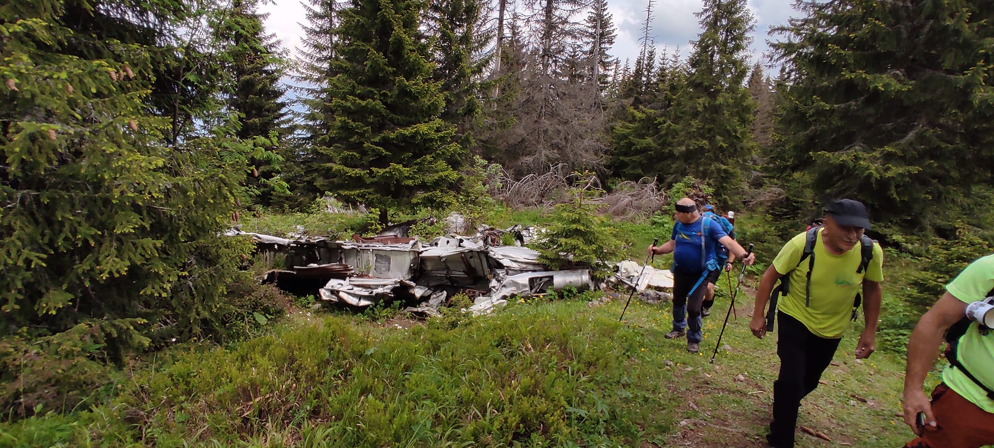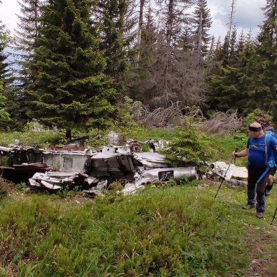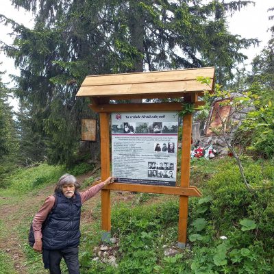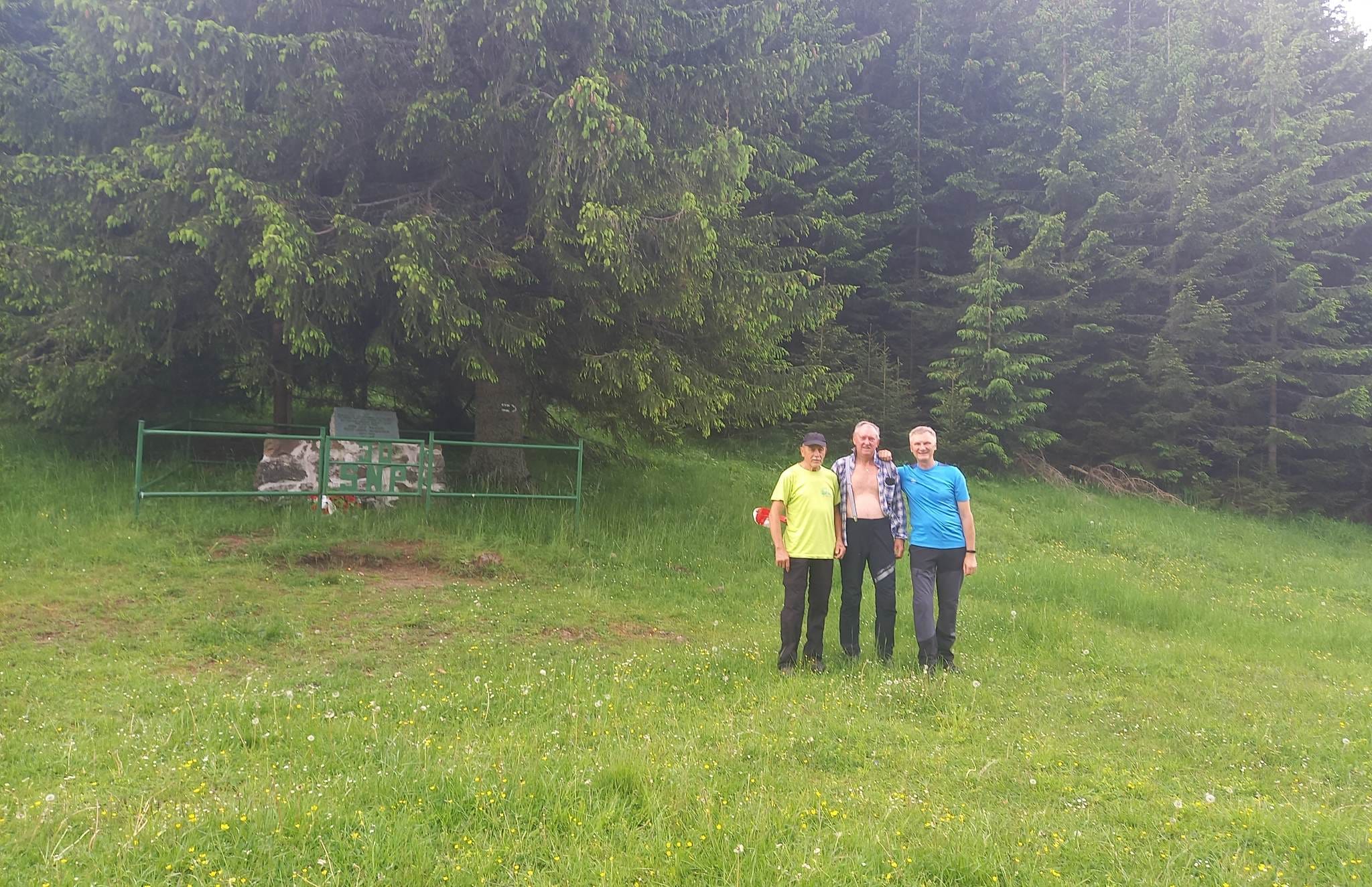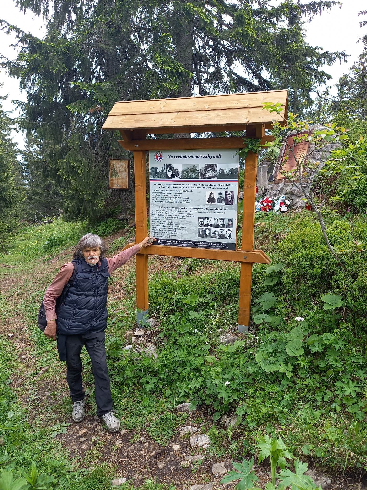 z našich batôžkov a spoločnom foto poberáme sa ďalej – na Slemä. Cestička je príjemná, stúpanie strieda klesanie, lúky zase riedky lesík na brale. Michalovské sedlo oddeľuje masív Ohnišťa od masívu Slemä. Z vrcholu Slemä krátka odbočka nás dovedie k ďalšiemu pamätníku SNP a troske zostreleného lietadla s neďalekou vyhliadkou. Popozeráme, pofotíme a ideme ďalej.