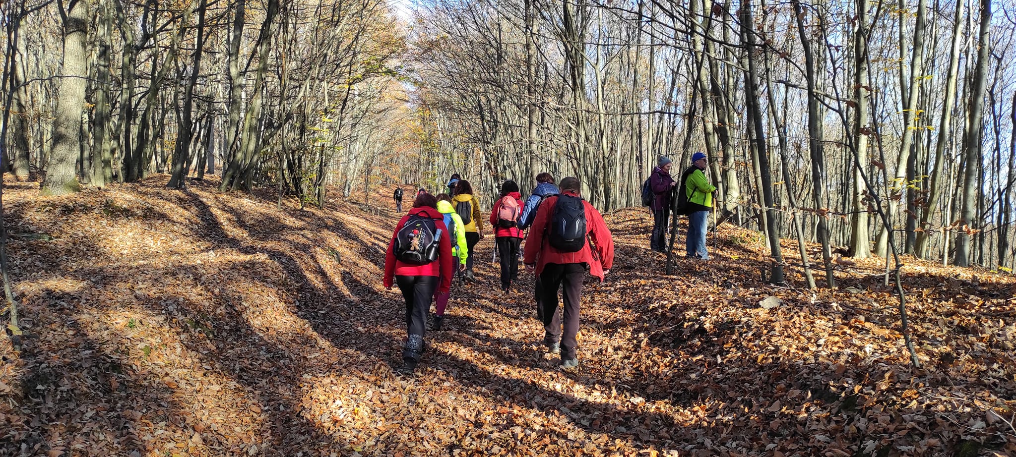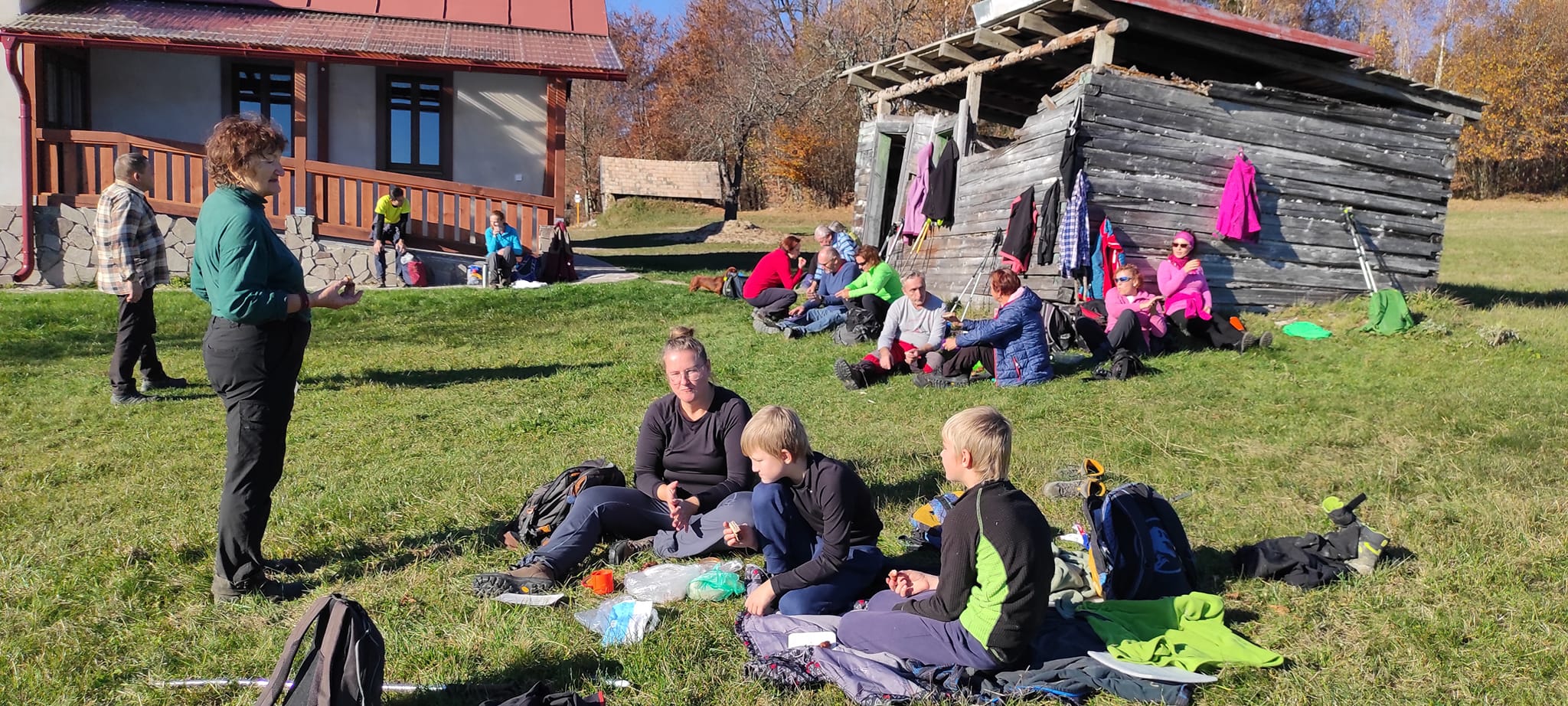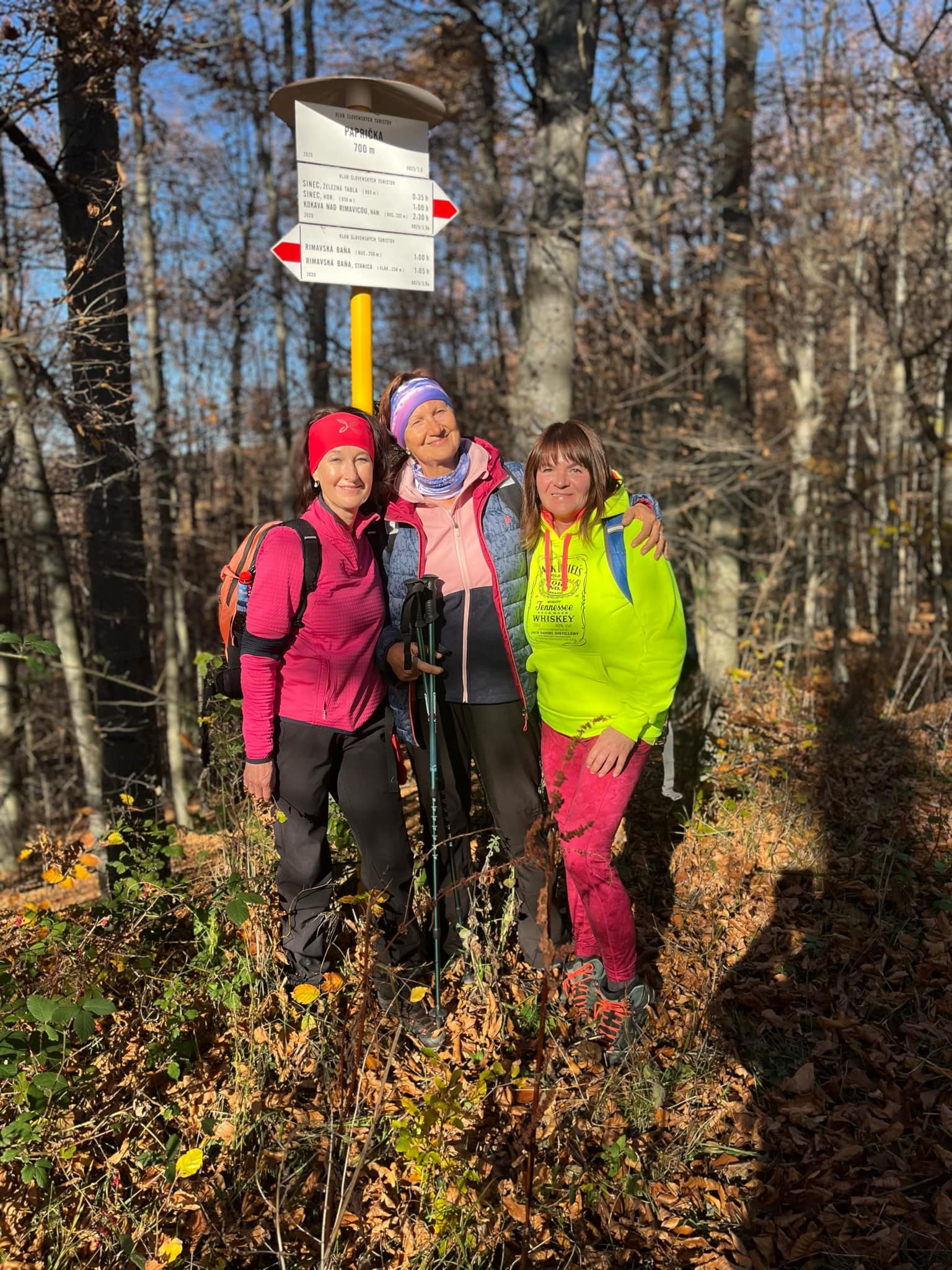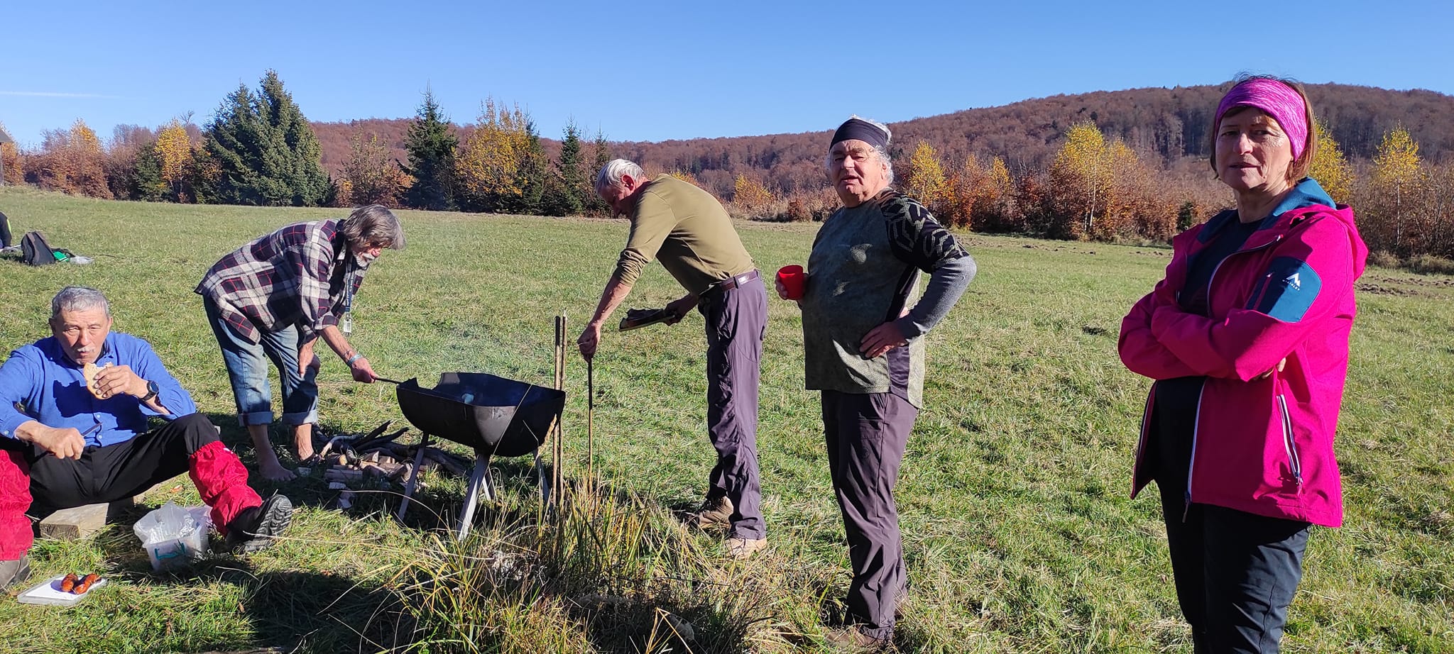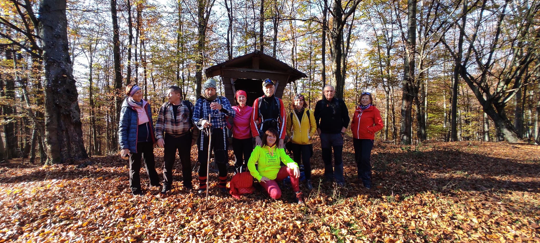 Postupne zo seba zhadzujeme vrstvu za vrstvou. Lístie šuchoce. Nálada je výborná. Humor nechýba, vtipkári sa nezaprú. Pri horárni na Sinci nás čaká pripravené ohnisko na opekanie.