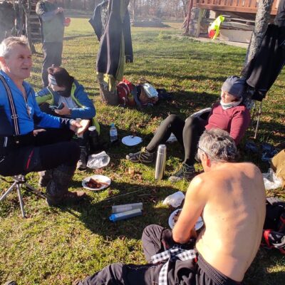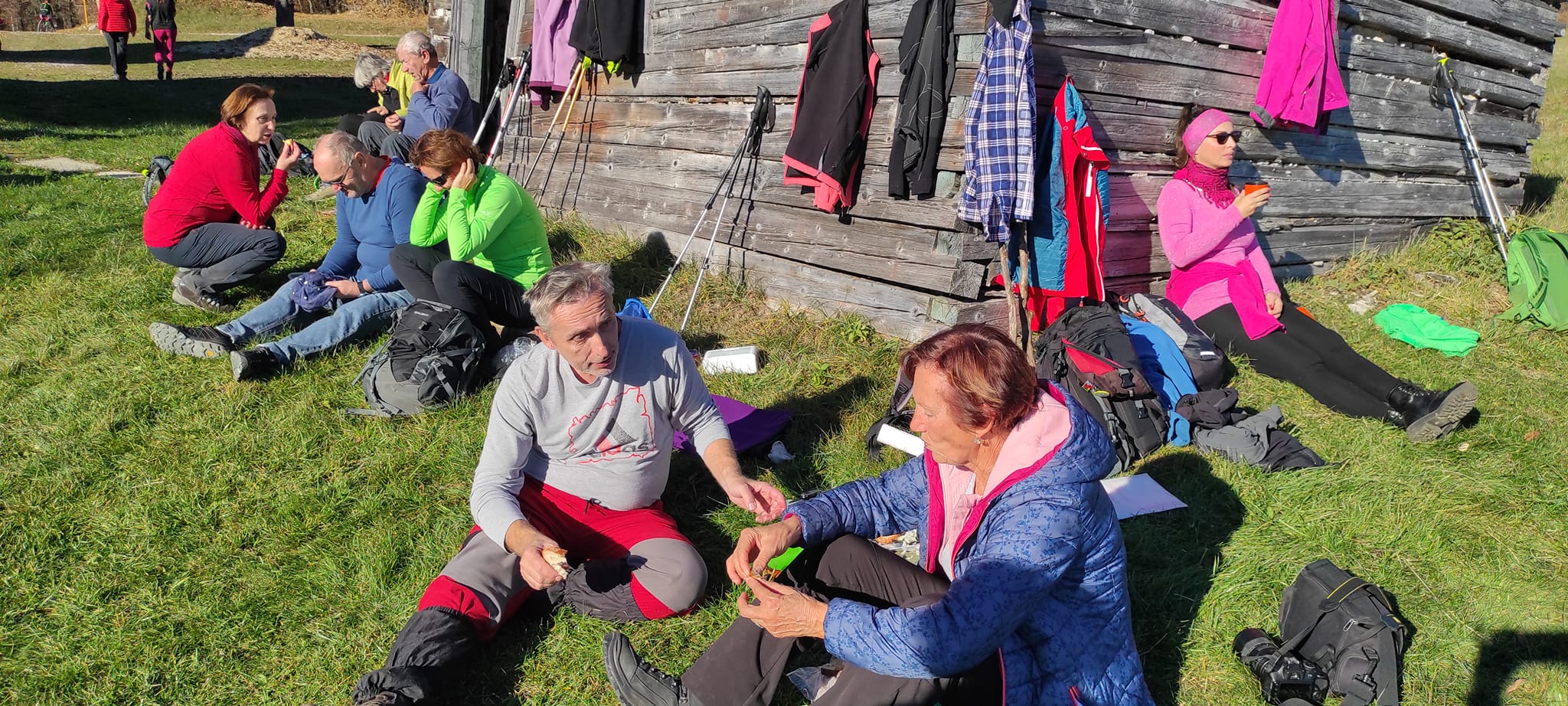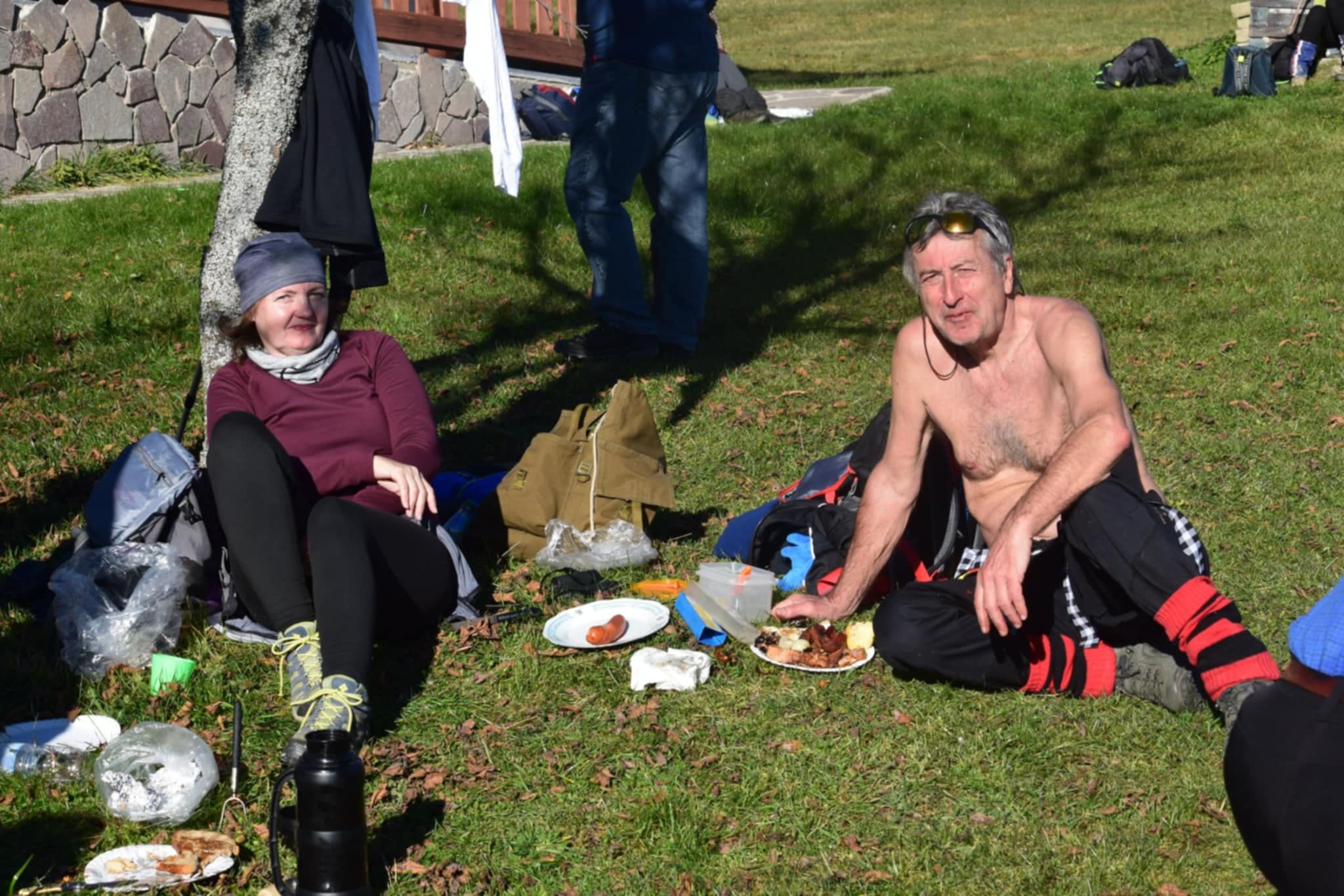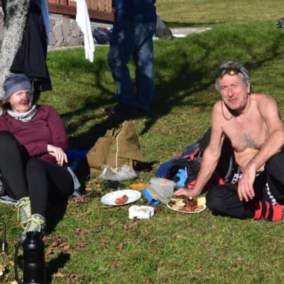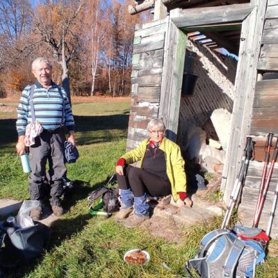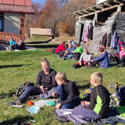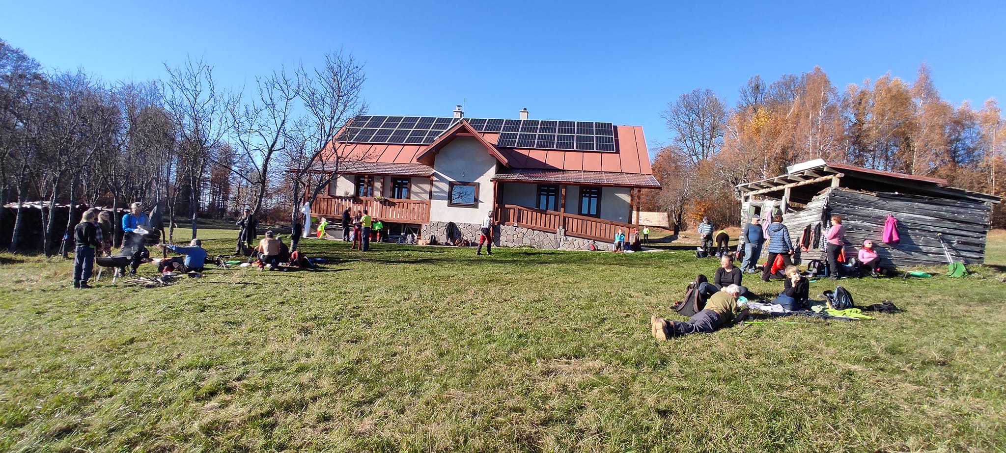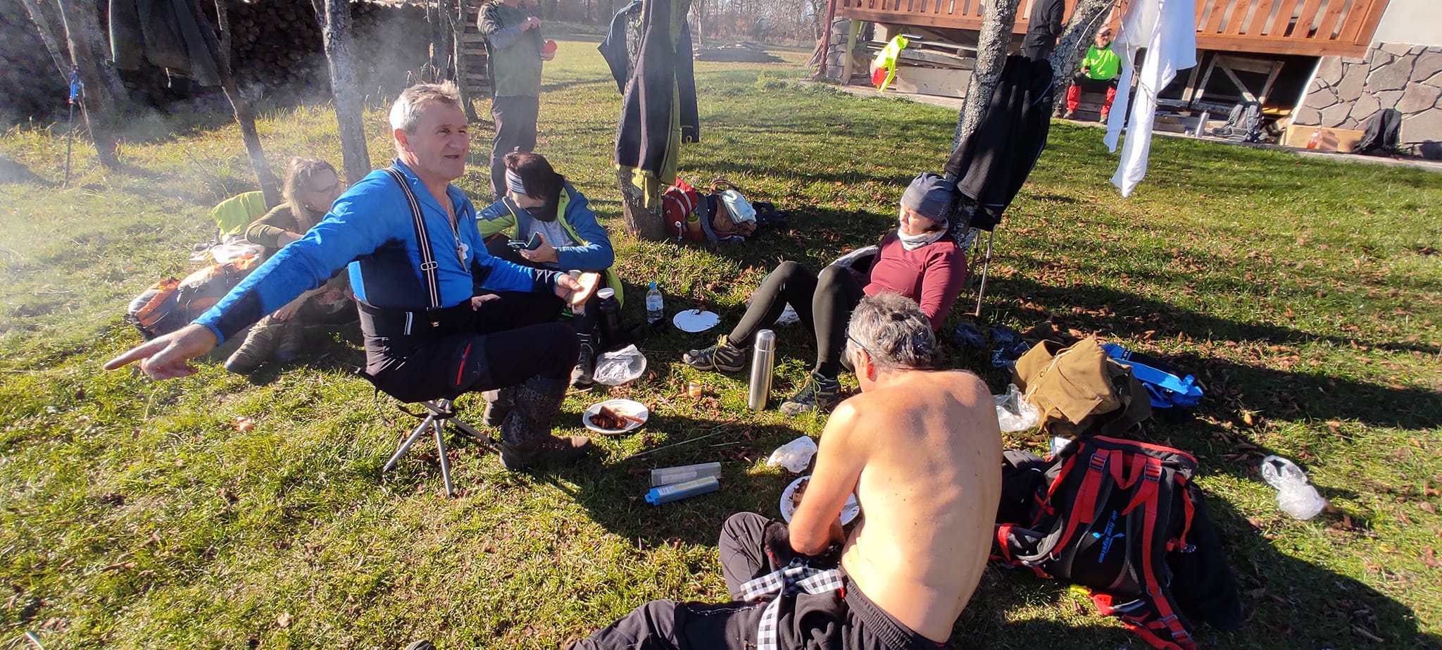 Postupne zo seba zhadzujeme vrstvu za vrstvou. Lístie šuchoce. Nálada je výborná. Humor nechýba, vtipkári sa nezaprú. Pri horárni na Sinci nás čaká pripravené ohnisko na opekanie.