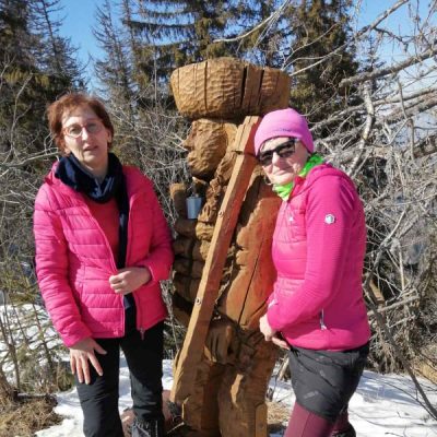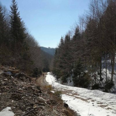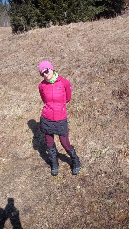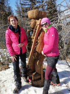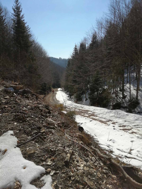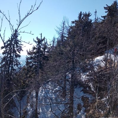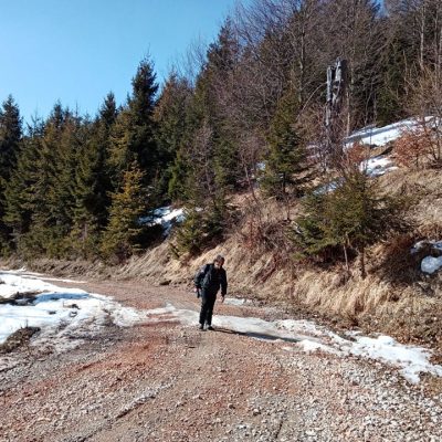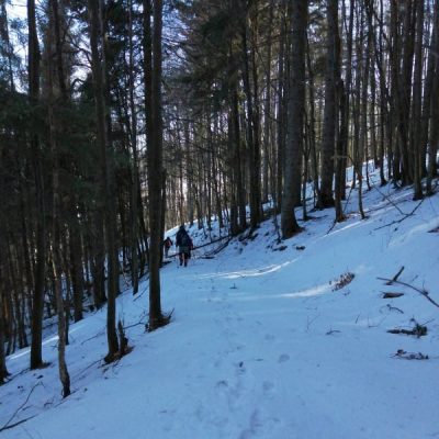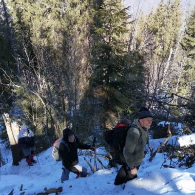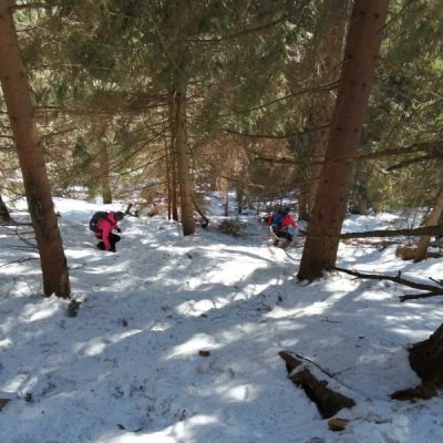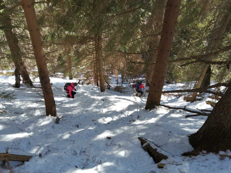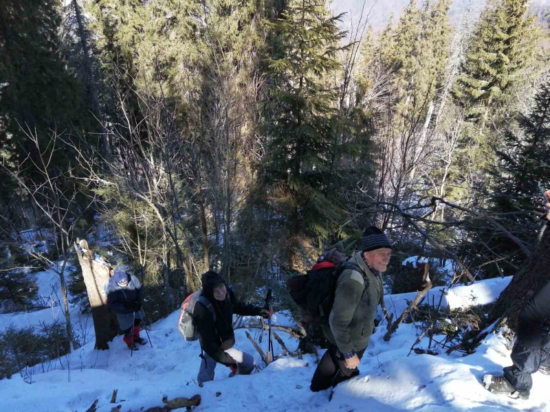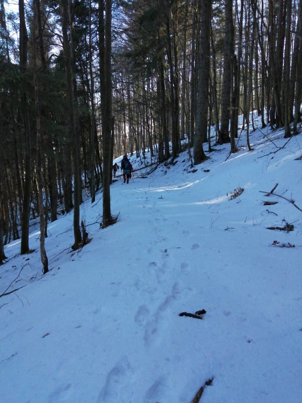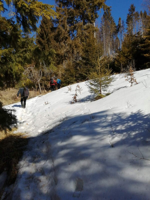 Nevieme, čo nás na trase čaká. Jarný výstup býva často zradný a náročnejší, ako ten z trilógie. A je to tu! Snehu začína pribúdať a obúvajú sa stúpacie železá, čiže nesmeky, lebo skaly pod snehom sú zľadovatené. Máme šťastie, Vepor nás pustil k Jánošíkovi s truhlicou. Za slnečného počasia sa nám odkrývajú malebné výhľady Vysokých a Nízkych Tatier, Hradová, Okrúhla skala a tiež dvojča nášho Vepra, Ľubietovský Vepor. Ako správni turisti nasledujeme červenú značku. Tá nás vedie strmým zostupom, ako inak, tiež zľadovateným, ale dali sme to.
