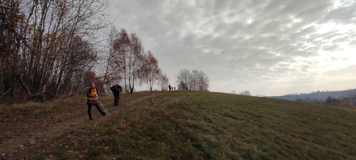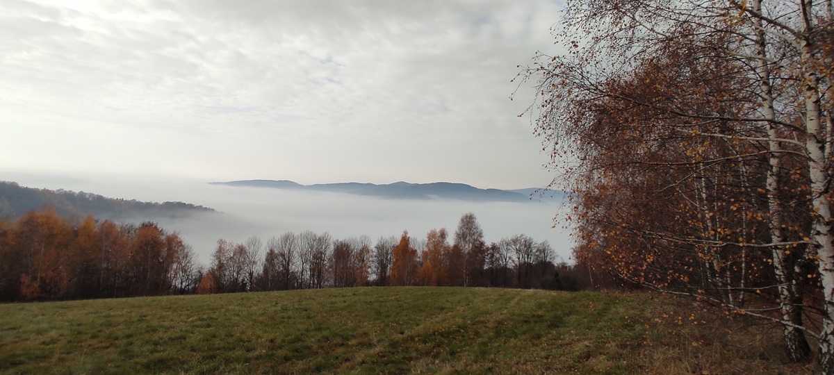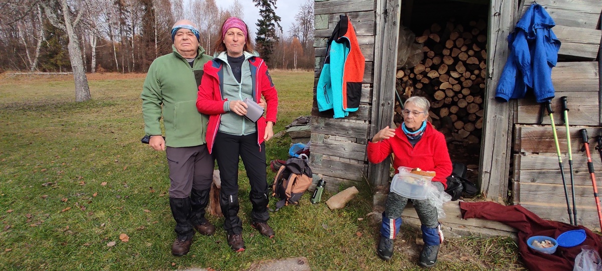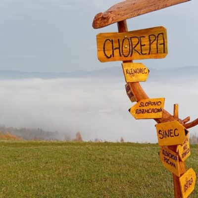 Pri smerovníku Chorepa krátka zastávka, prvé občerstvenie a išlo sa ďalej. Tak, po zahrievacom kole sme v dobrej nálade, rôznym tempom, putovali príjemnou cestou po žltej značke a obdivovali výhľady napravo a naľavo. Boli krásne. Už síce nie také pestrofarebné ako boli pred mesiacom. Teraz dominovala skôr tmavošedá, sem tam oživená žltou farbou ihličia červených smrekov.