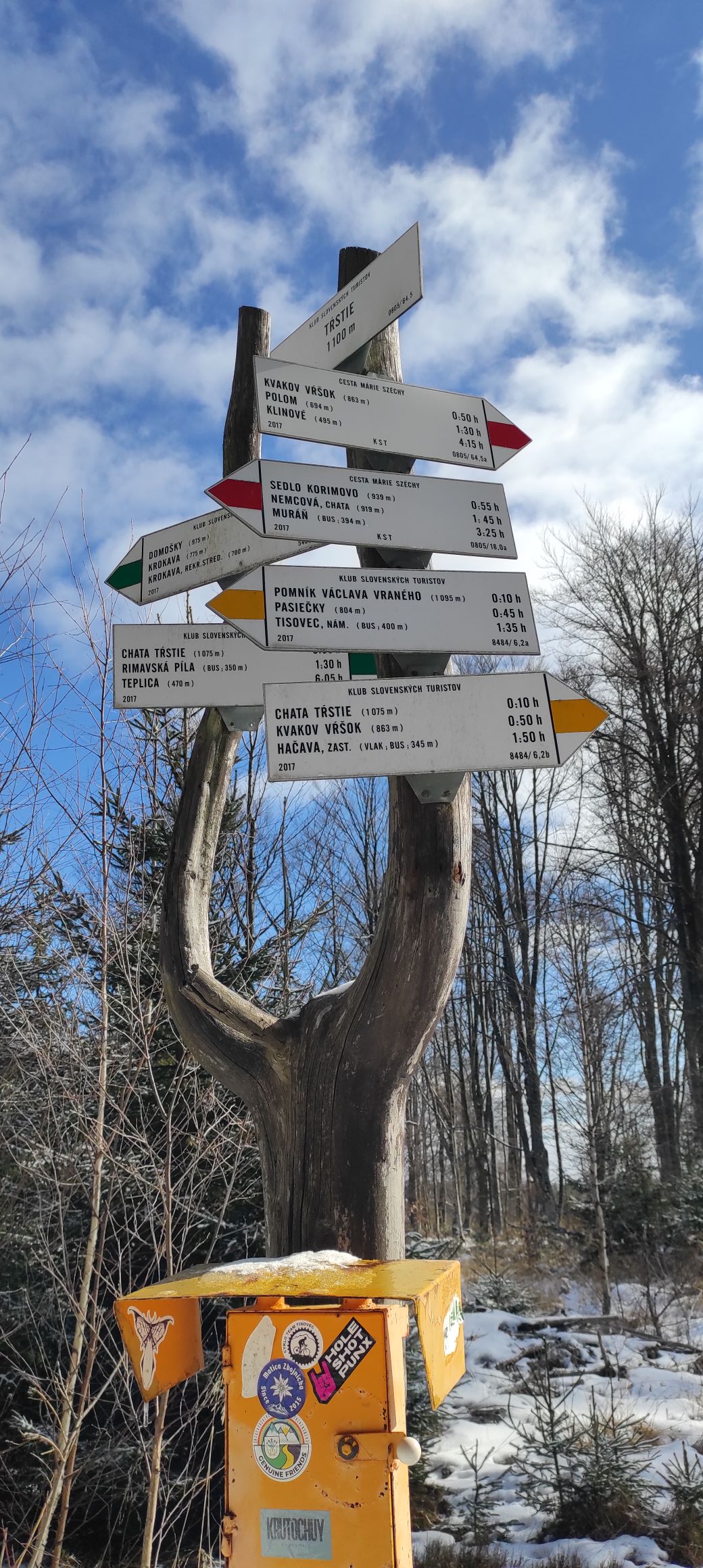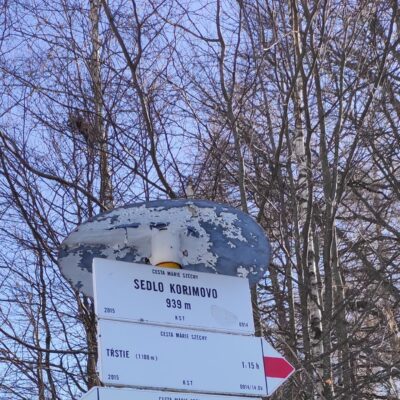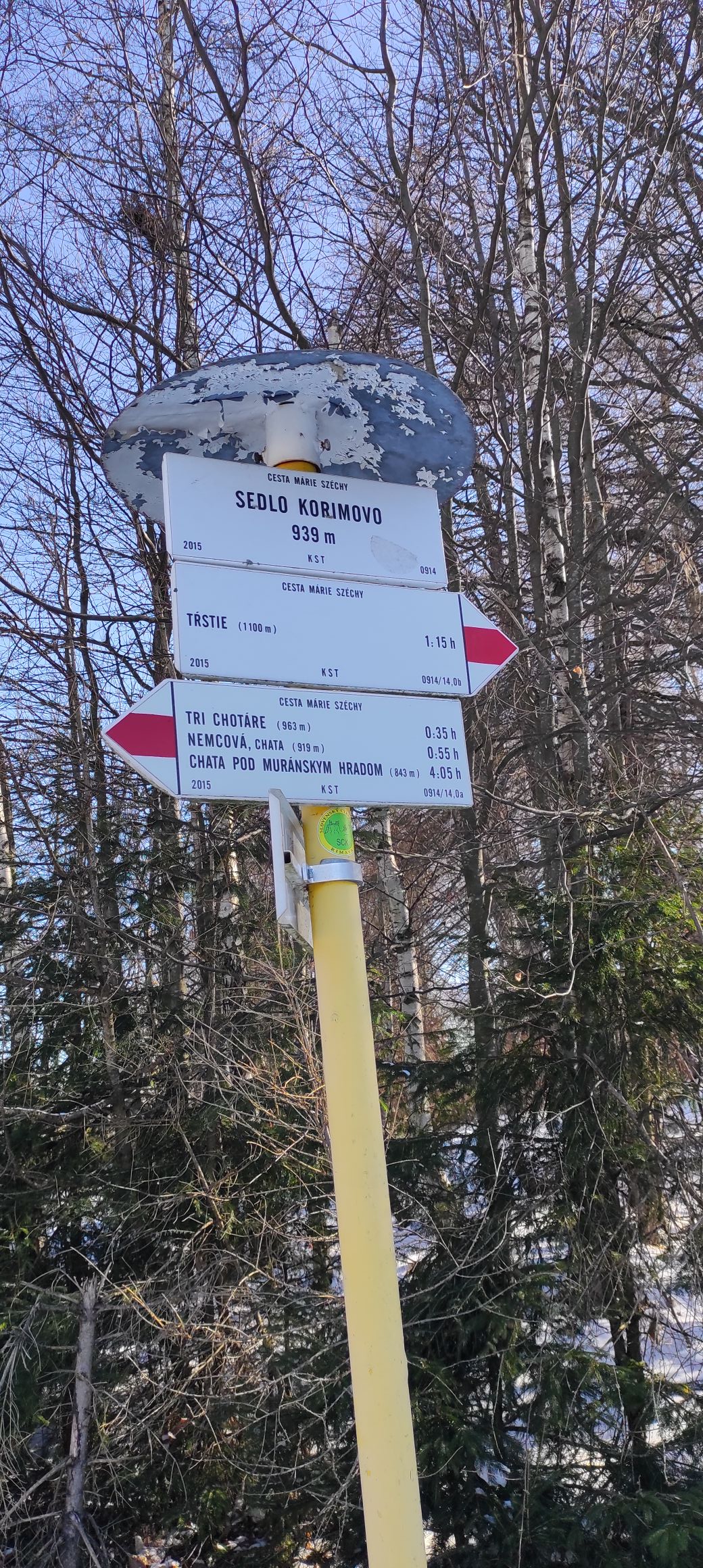 Od Sedla Korimovo sa napájame na červenú značku. Chodník nás vedie na chrbát Tŕstia. S pribúdajúcimi výškovými metrami pribúda aj vrstvička snehu. Žiaľ nie sú to desiatky centimetrov, na ktoré sme boli zo zimných výstupov zvyknutí.