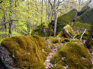Cestou po hrebeni sa nám naskytli krásne pohľady na Kráľovu hoľu, Volovské vrchy, Slovenský kras, ale aj na južnú časť hraníc s Maďarskom. Čas na smerovníku zo Železníka do Rákoša síce ukazoval 40 min., ale nám to trvalo o niečo dlhšie. Žltá značka nás priviedla k takej nádhere, od ktorej sme sa dlho nevedeli odpútať. Mohutné, machom obrastené celé skaliská, či menšie skaly s množstvom otvorov. Nádhera! Jaskynné otvory z dôvodu veľkého nebezpečia boli opatrené betónovými panelmi.